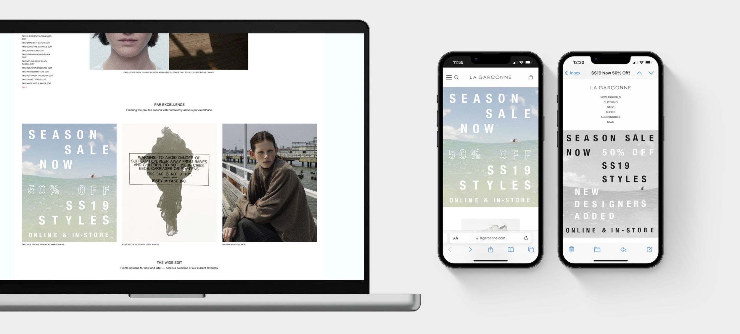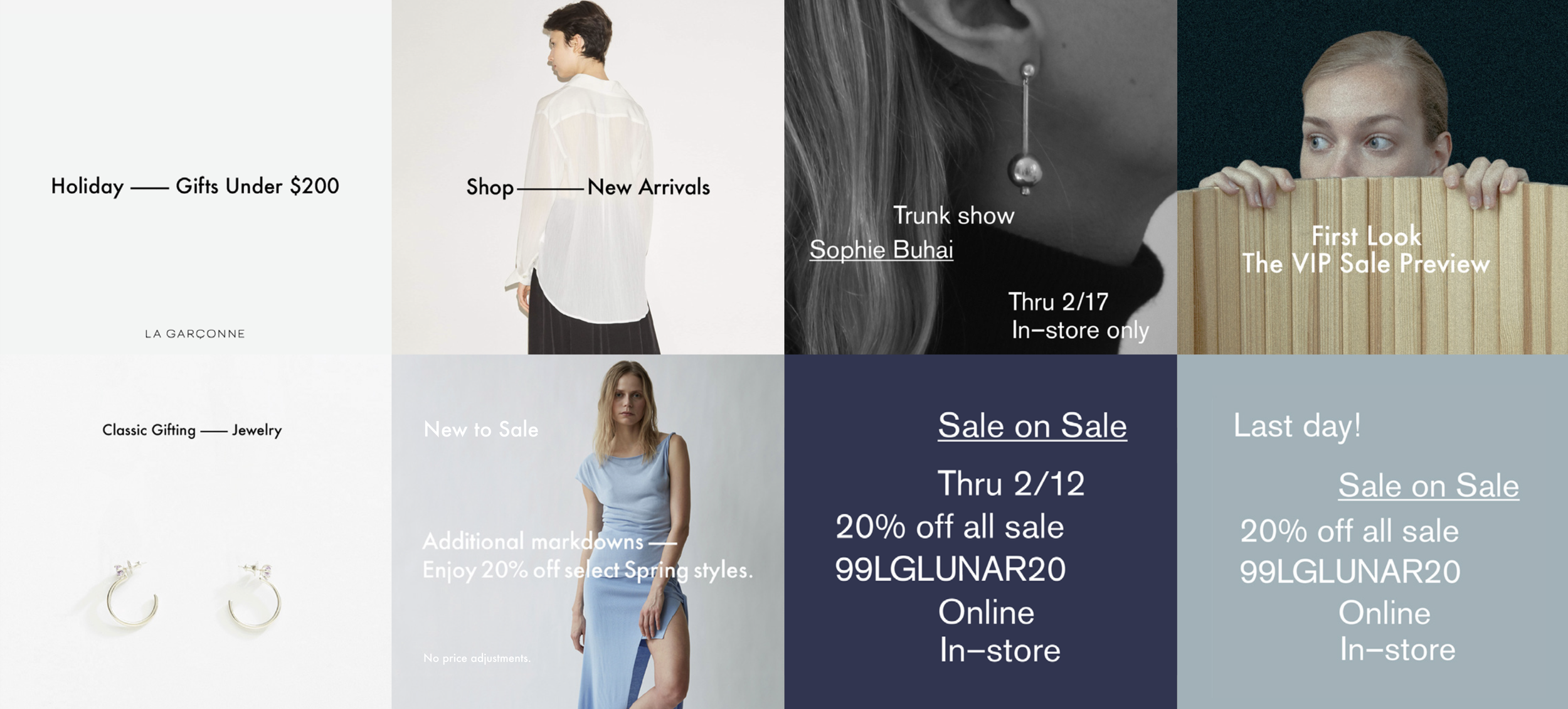 Owned the luxury womenswear retailer's weekly email campaigns, product-based PDP photography, homepage updates, and digital editorial layouts — all designed to balance seasonal brand and product storytelling with merchandising priorities.